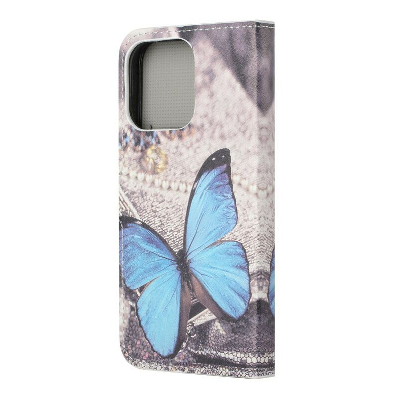 Här är ett fodral dekorerat med en magnifik fjäril som håller fast din iPhone 13 i plånboksstil.
