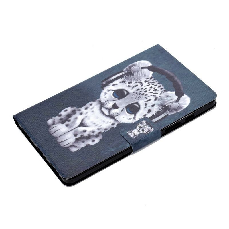 Ett Samsung Galaxy Tab A7 Lite litet leopardfodral som tycker om att lyssna på musiken det njuter av.