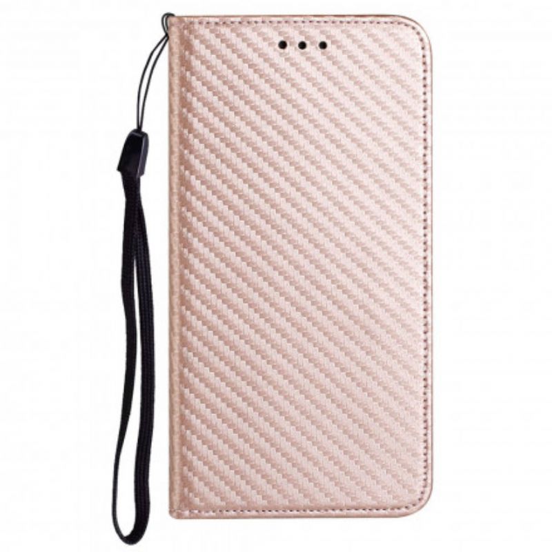 Din iPhone 13 är helt säker med detta flip-fodral med kolfibertextur som kommer med en rem.