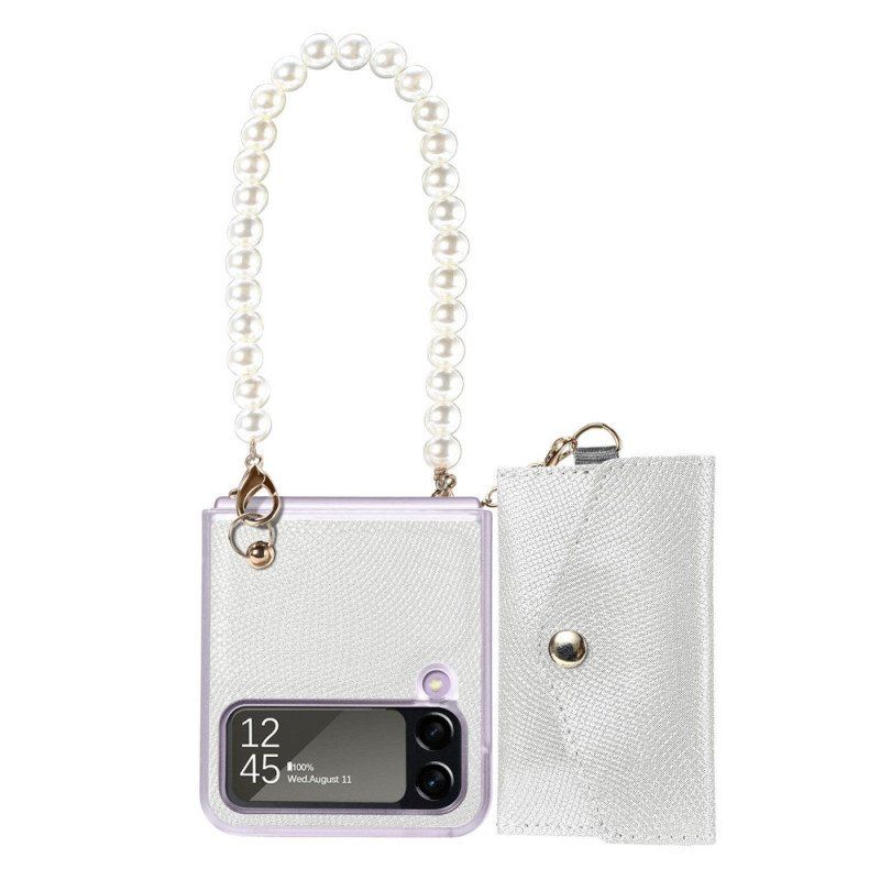 Din Samsung Galaxy Z Flip 4 Ser Vacker Ut Med Det Här Fodralet Försett Med En Snygg Pärlrem Och En Korthållare.