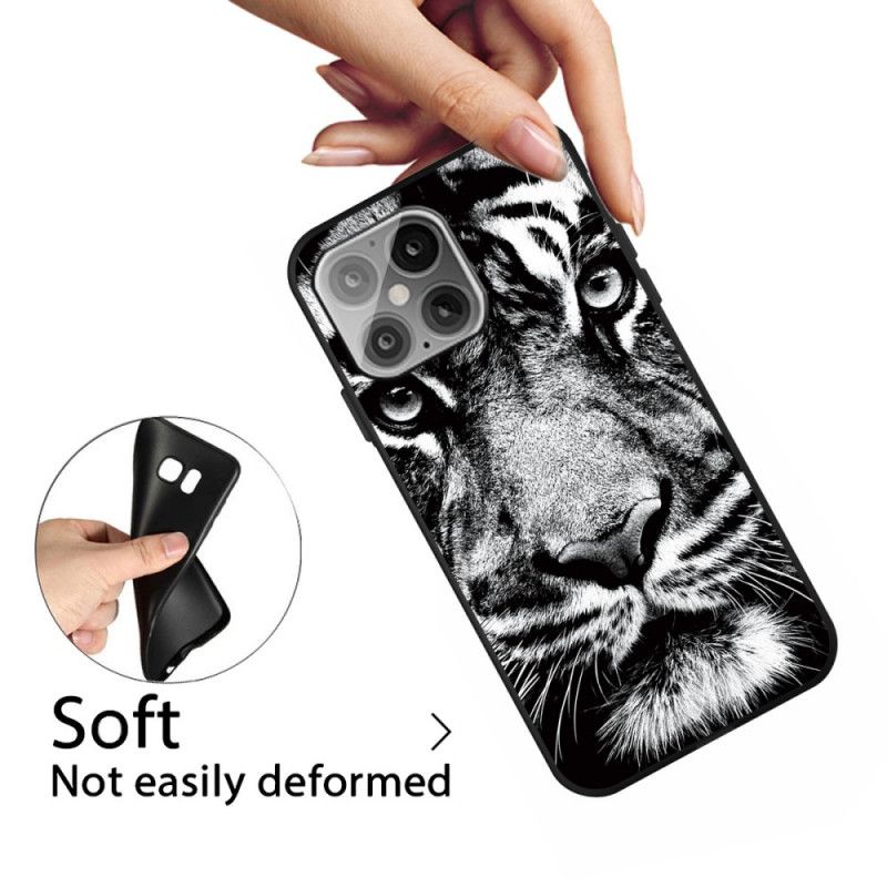Din iPhone 12/12 Pro är väldigt säker med detta silikonfodral dekorerat med en svartvit tiger.